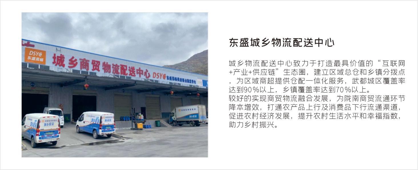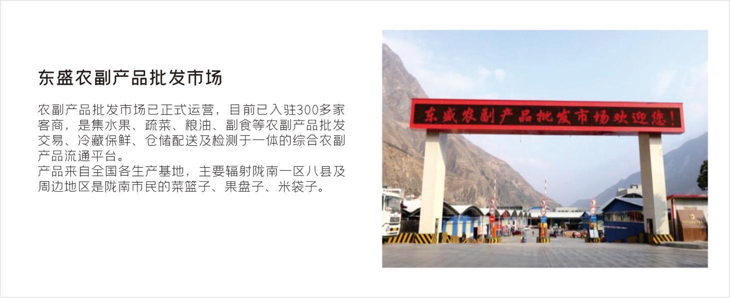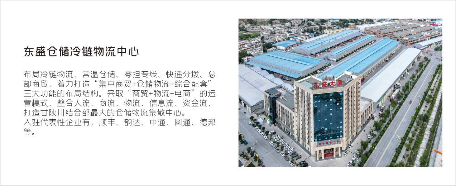 东盛物流运营的陇南东盛国际商贸物流港,定位集农副产品、家居建材、五金机电、小商品小百货、仓储物流、电子商务、综合配套于一体的现代商贸物流集散中心,项目占地370亩,总建筑面积48.5万平方米,总投资17.31亿元,截止2022年物流园区总交易额突破50亿元。先后被授予“国家农业农村部定点市场”、“国家级商贸流通标准化试点企业”“甘肃省八大重点市场之一”、“甘肃省农业产业化重点龙头企业”。
