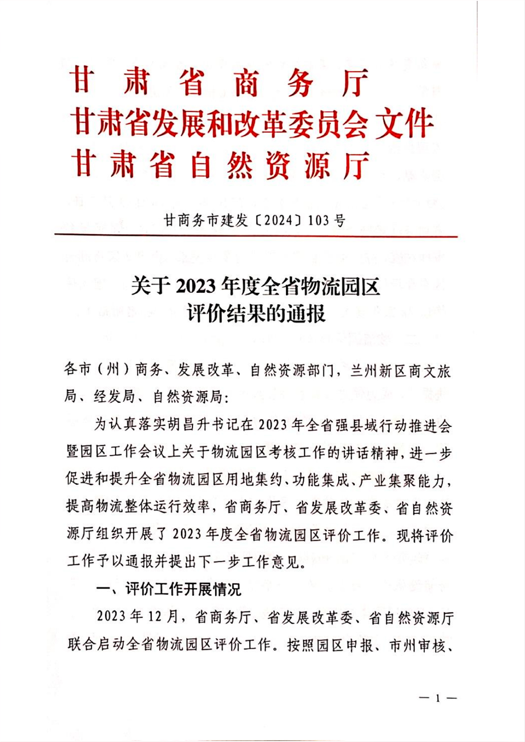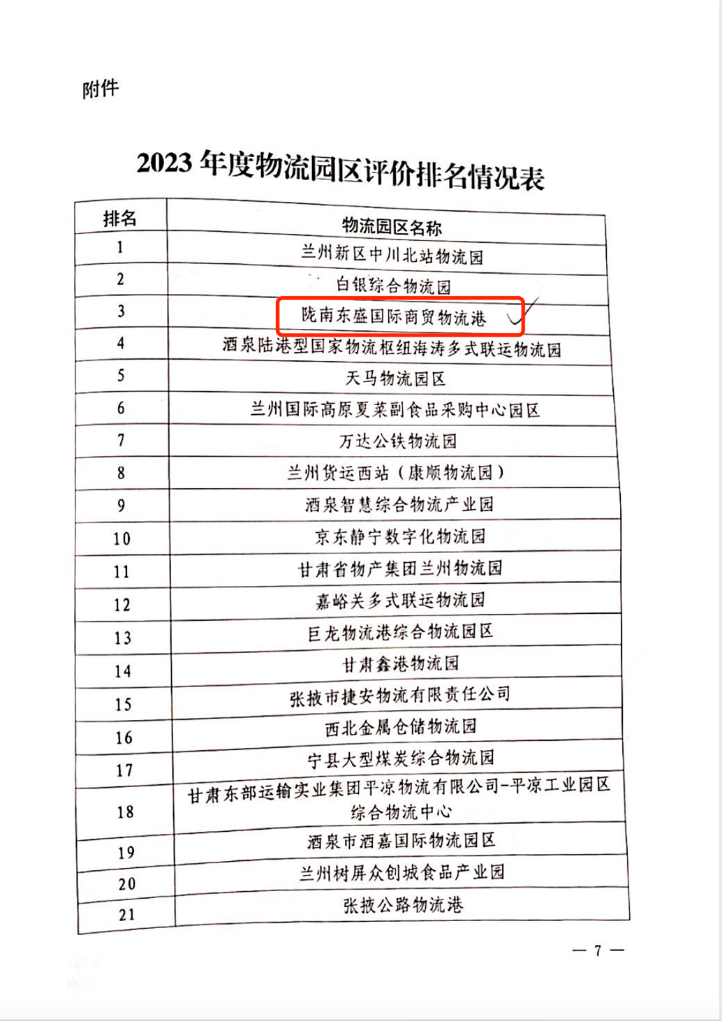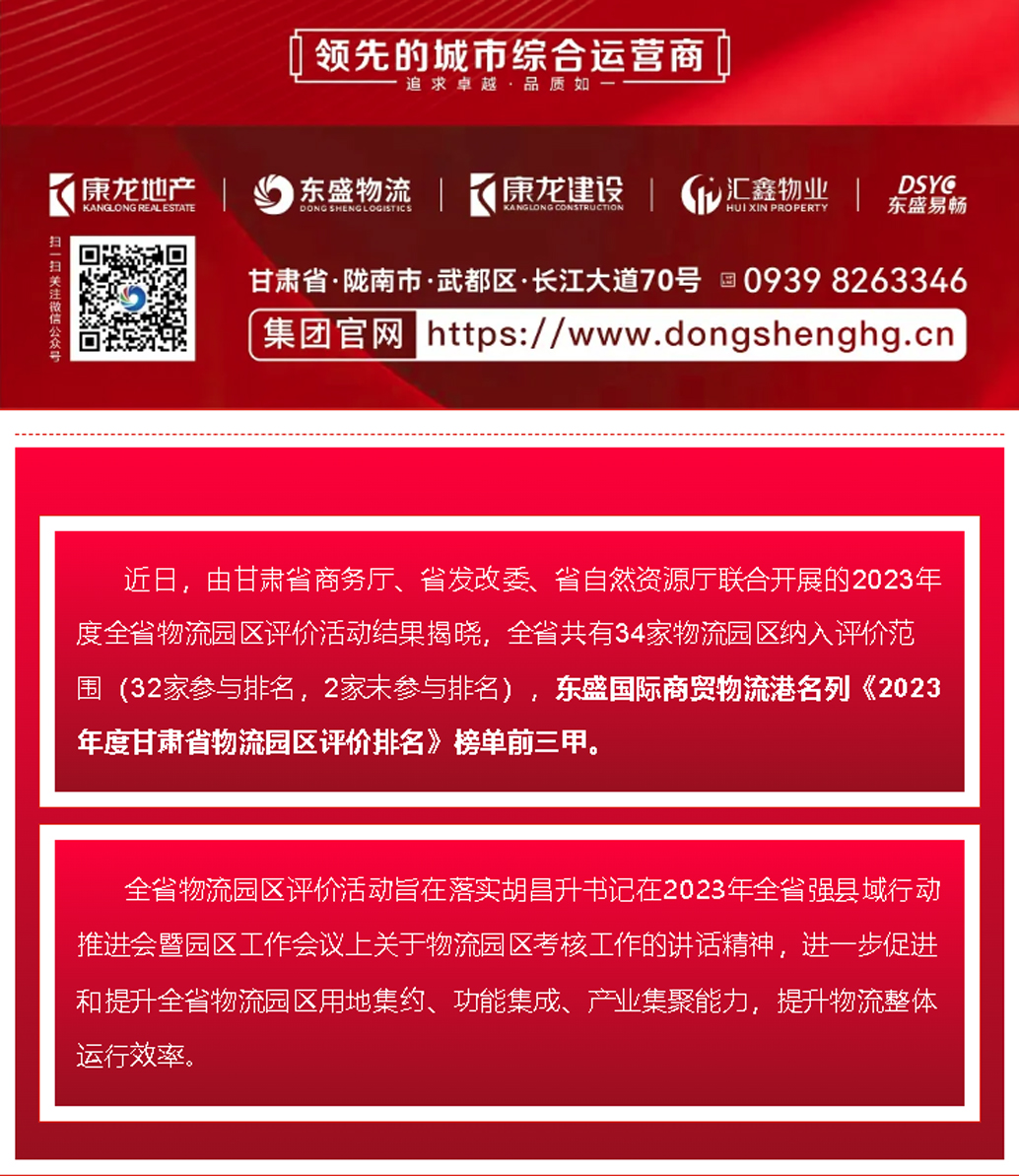东盛之光丨陇南东盛国际商贸物流港名列《2023年度甘肃省物流园区评价排名》榜单前三甲